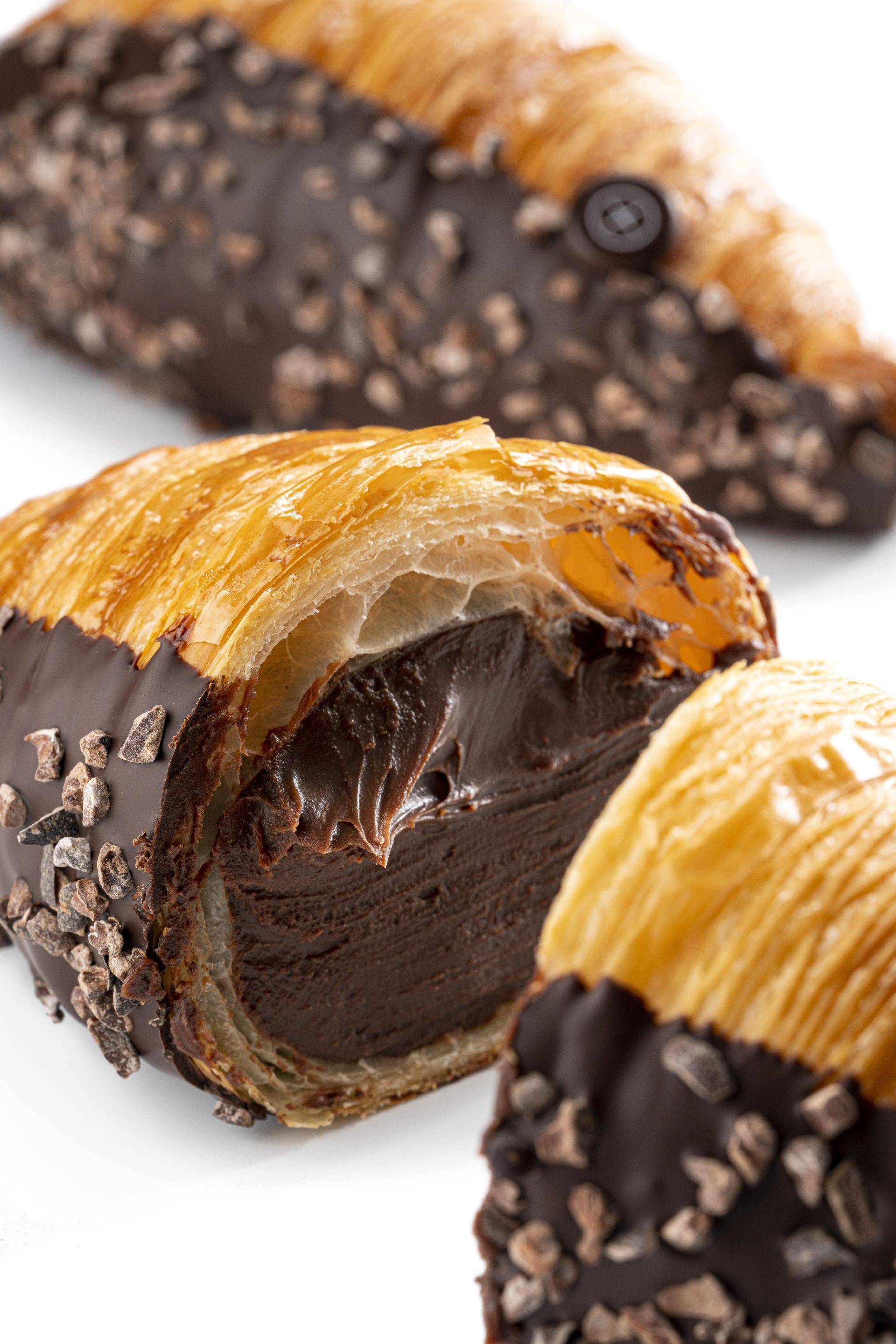 INTENSITY AND CHARACTER Raúl Bernal opts for the intensity of Maragda 70% couverture and the bitterness of cocoa nibs to create a chocolate croissant with intense flavour and unique character.