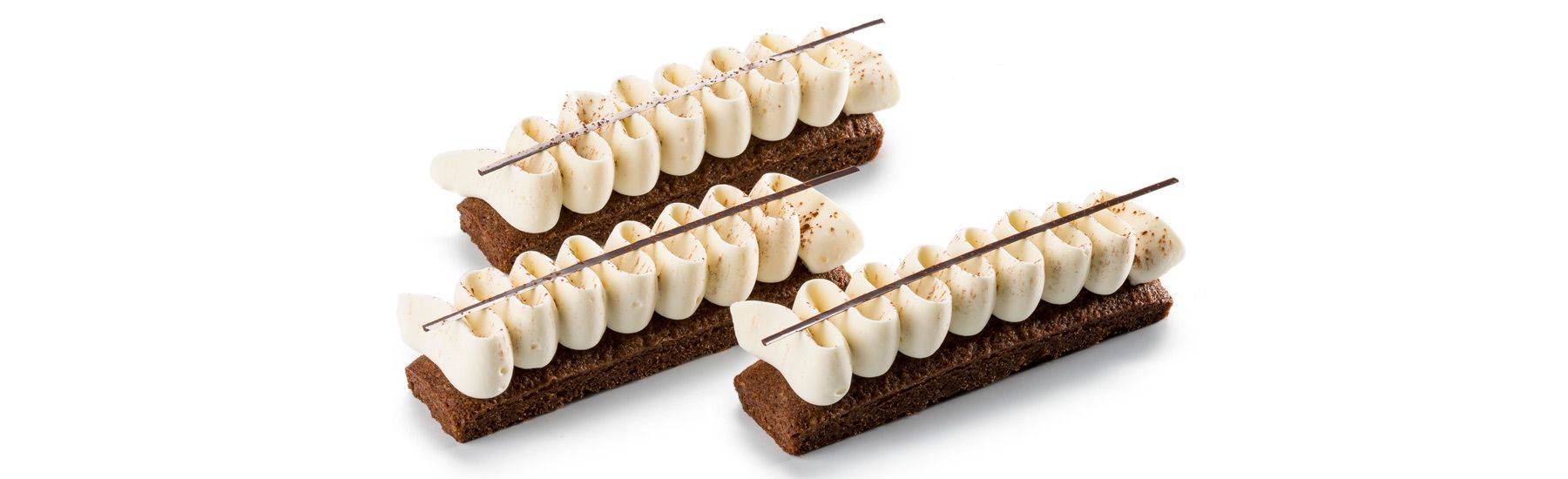 Pour a spiral on top of each chocolate sponge cake lengthwise.