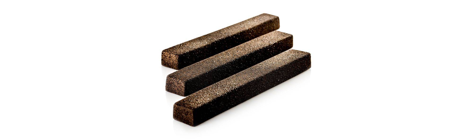 Place in the refrigerator for a while and airbrush with dark chocolate tempered to 32ºC to get a velvet effect.