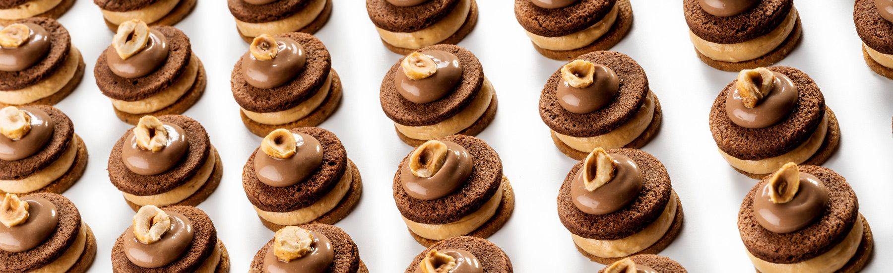 A sweet (and crispy) finale. Hazelnut and chocolate are the absolute stars of this petit four by Raúl Bernal presented in the shape of delicate little filled biscuits. The crispy hazelnut sablé biscuit base combined with hazelnut mousseline, the chocolate and hazelnut sponge cake and the Jade couverture cream offer a range of textures for enjoying in a single mouthful.