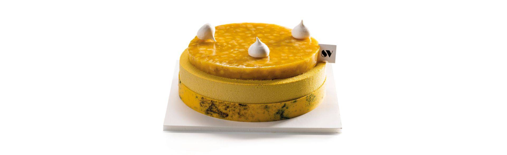 Heat the milk to 80ºC and add the soaked gelatin, the Jade milk chocolate couverture and the passion fruit purée, applying emulsion with the electric beater. At 30ºC, add the semi-whipped cream and stir carefully. Completely fill the 4.5 centimetre ring from top to bottom with the sponge disc, the hazelnut praline mousse and the Jade and passion fruit bavaroise. Store in the blast chiller until ready for the velvet spray paint.