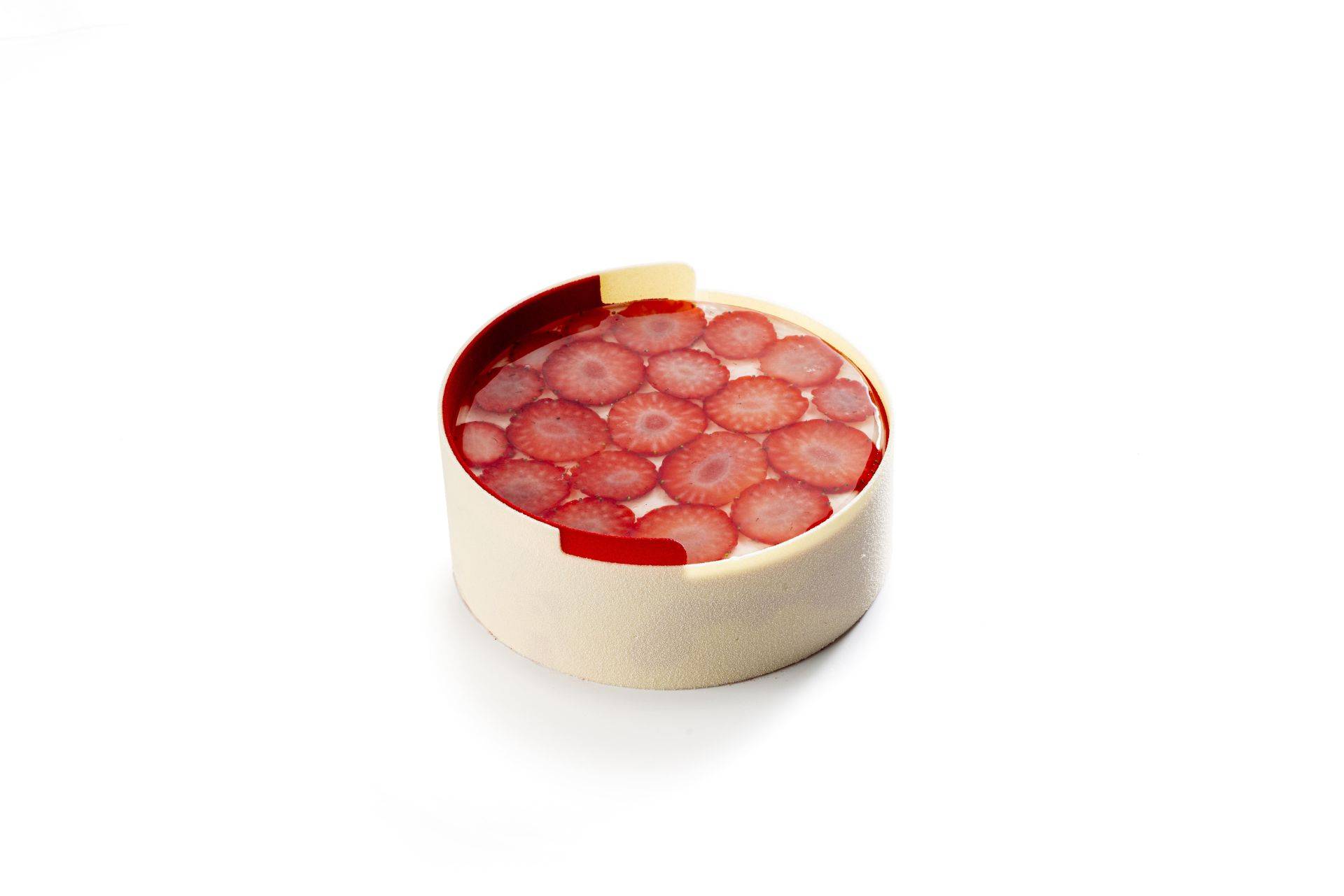 SPRING-SUMMER CAKE COLLECTION Maresme strawberries are the show-stopping stars of this cake from Albert Daví's summer collection, inspired by the classic fraisier. Sheep's milk yoghurt and Opal 30.3% white chocolate give it an interesting dairy touch.