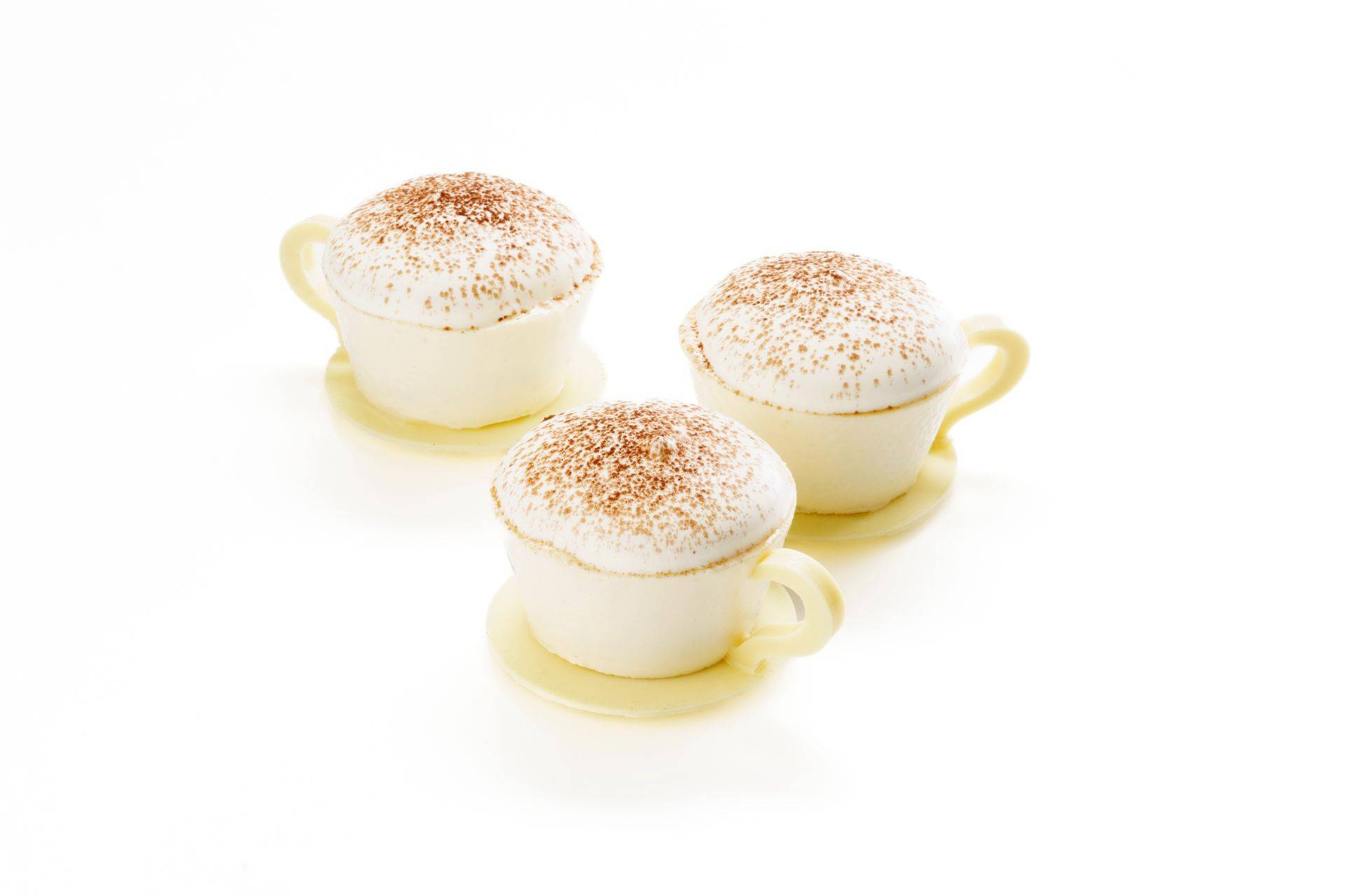 Make a chocolate disc with Opal 30,3% White Chocolate so it looks like a saucer, then make a coffee cup handle and stick it to the tiramisu so it looks like a real cup.