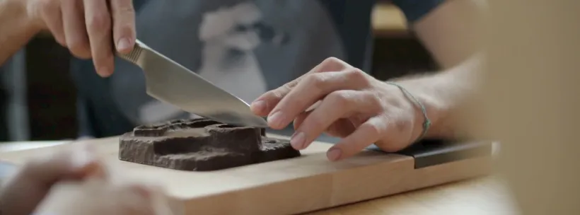Para nuestro primer maridaje reunimos al chef pastelero Raúl Bernal, embajador de Chocovic, y al artista plástico Vicente García Plana. A ambos les une, además del instinto artístico, el amor por su ciudad natal, Huesca, hogar y fuente de inspiración al mismo tiempo. Los dos aceptaron el reto de juntar sus talentos para crear una pieza de chocolate singular y exclusiva.