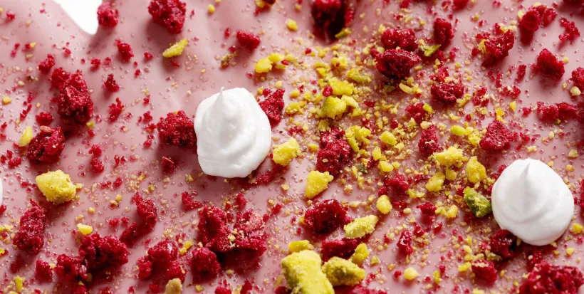 Para una súper fan del hojaldre como Mar Reyes, elaborar una palmera sin gluten fue un auténtico reto que ha superado con nota. Crujiente y cargada de toppings -pistacho, frambuesa liofilizada y merenguitos-, su deliciosa palmera de chocolate Ruby recibe todos los elogios de su clientela. Y si prefieres el chocolate negro, también está disponible con baño de cobertura Maragda 70%.