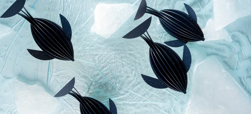 La primera figura la colección es el Pingüino emperador, una pieza elaborada con chocolate blanco Opal 30,3% y cobertura negra Maragda 70%, que transmite su majestuoso posado a partir de este estilo minimalista. La propuesta se completa con otras dos figuras: la ballena azul y el zorro del ártico.