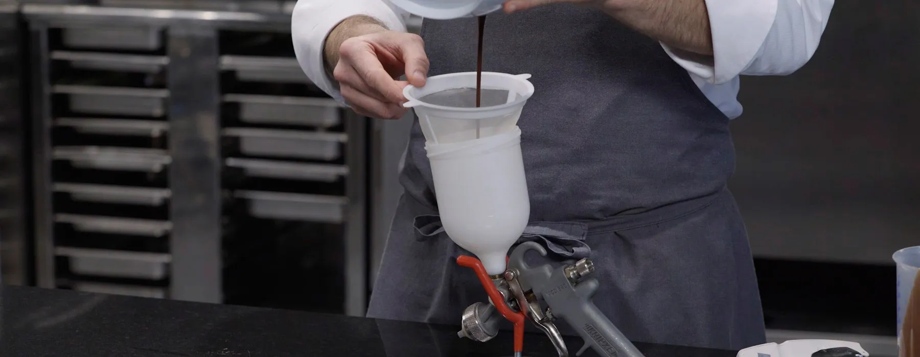 Es la técnica de pintado a presión para conseguir un acabado brillante o aterciopelado de piezas de pastelería.