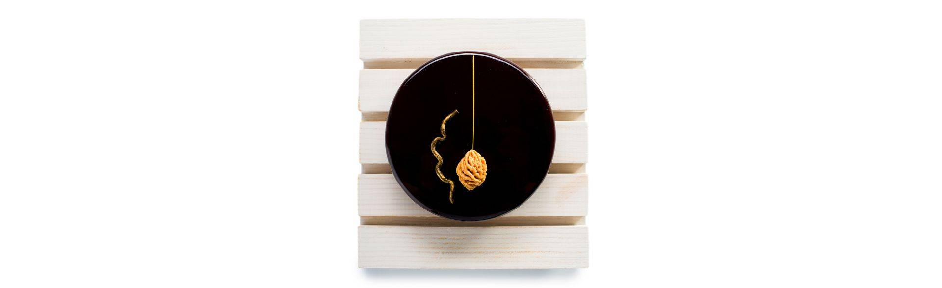 En el fondo del molde ponemos un capa de mousse de ocumare. Seguidamente un disco de bizcocho, presionando para que suban las paredes. Cubrimos con una capa ligera de mousse de avellana, sobre ella un disco de gelificado de melocotón.