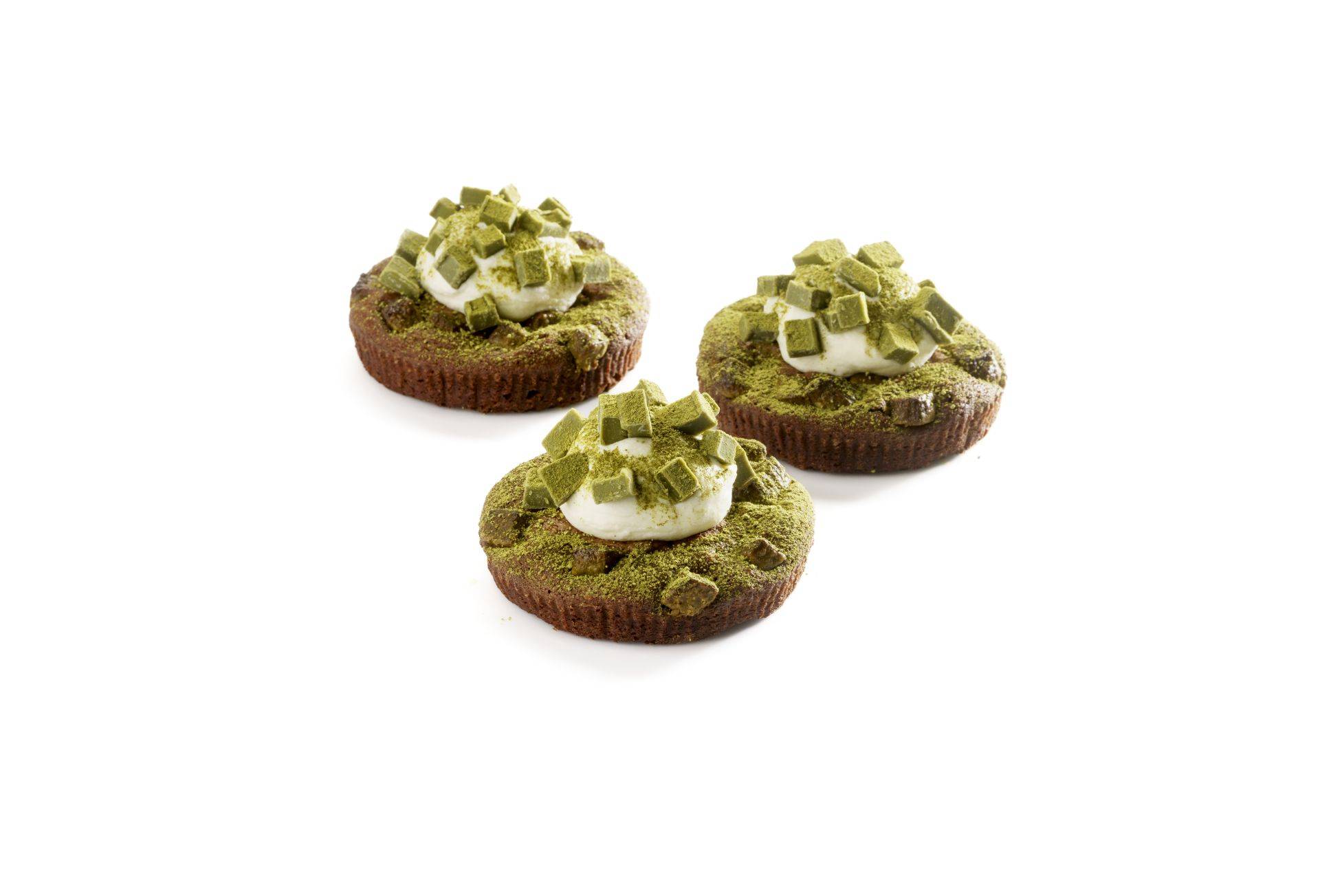 Una vez tenemos el brownie con los dados de té verde cocido, decorar con una crema montada de mascarpone, dados de chocolate con té macha.