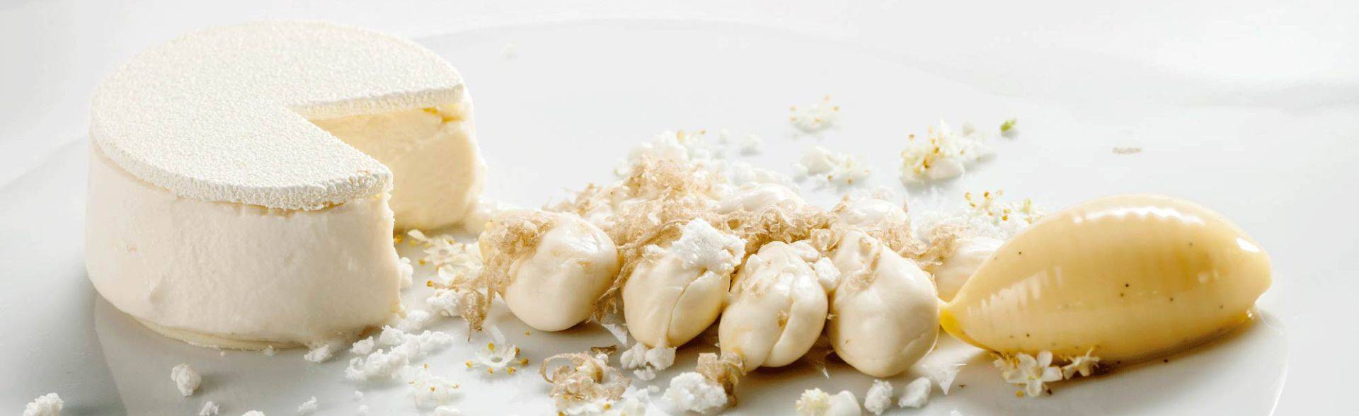 Triturar las almendras, leche, nata, sal y amaretto. Calentar a 70 ªC. Añadir zumo de limón y el cuajo vegetal, remover y dejar reposar 10 minutos. Volver a calentar hasta que esta mezcla se corte (es precisamente lo que buscamos) y volver a dejar reposar durante 30 minutos. Pasar por una estameña presionando fuertemente hasta conseguir una crema lisa.