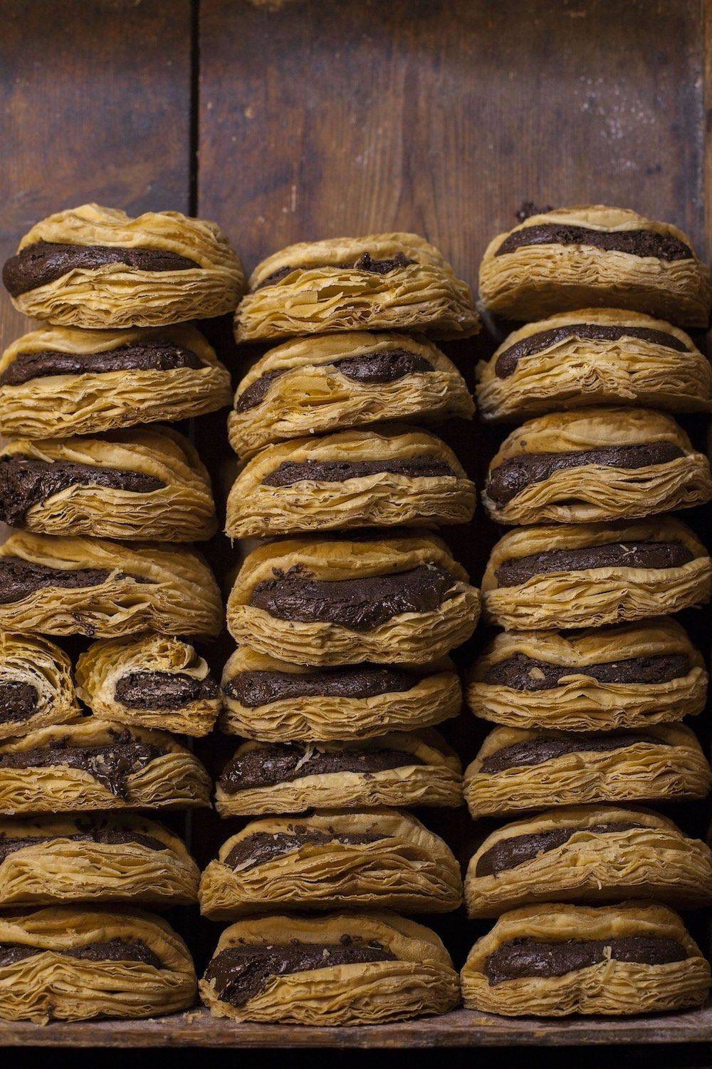 Mezclar a mano la mantequilla con la harina hasta obtener un rectángulo plano y reservar en frío: esta será la capa que irá por fuera.
