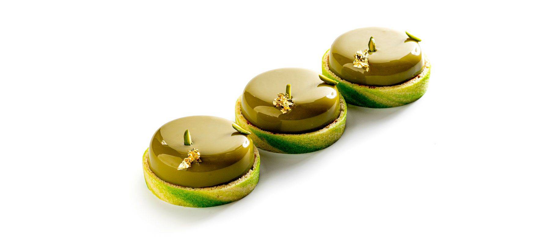Glasear a 32ºc y presentar encima del sablé de pistacho y decorar con una tira de bizcocho Gioconda de pistacho, finalizar este individual con pistachos verdes crudos cortados muy finos y pan de oro.