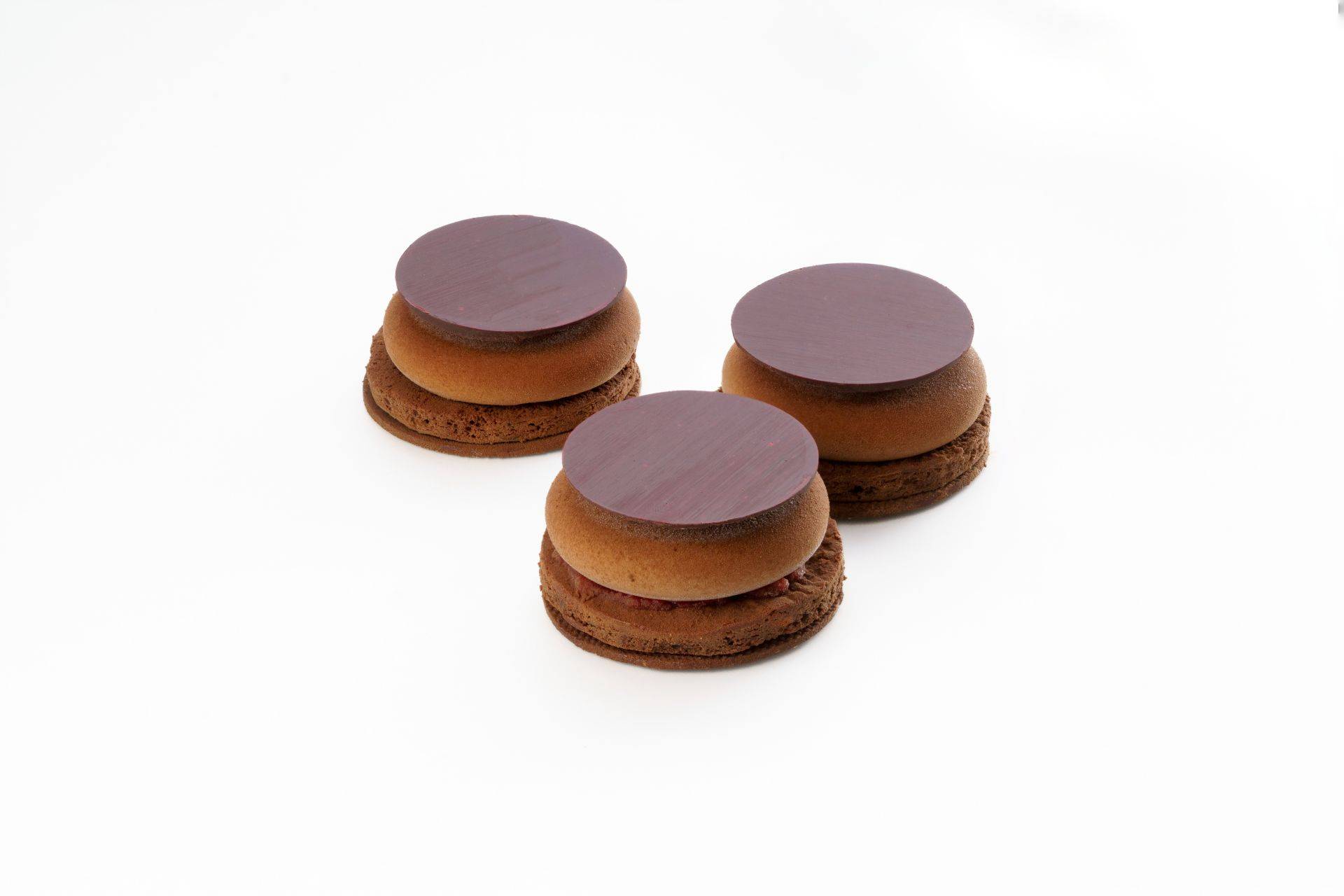 Dosificar una gota de praliné de almendra sobre el sablé y adjuntar un disco de bizcocho Sacher.